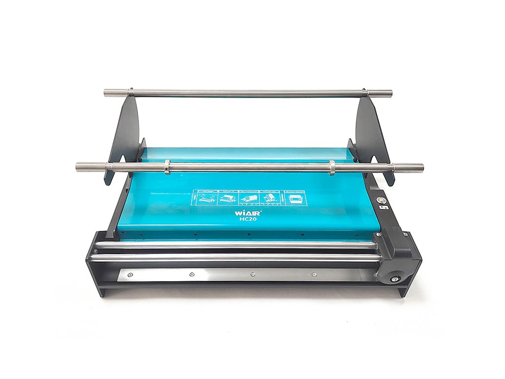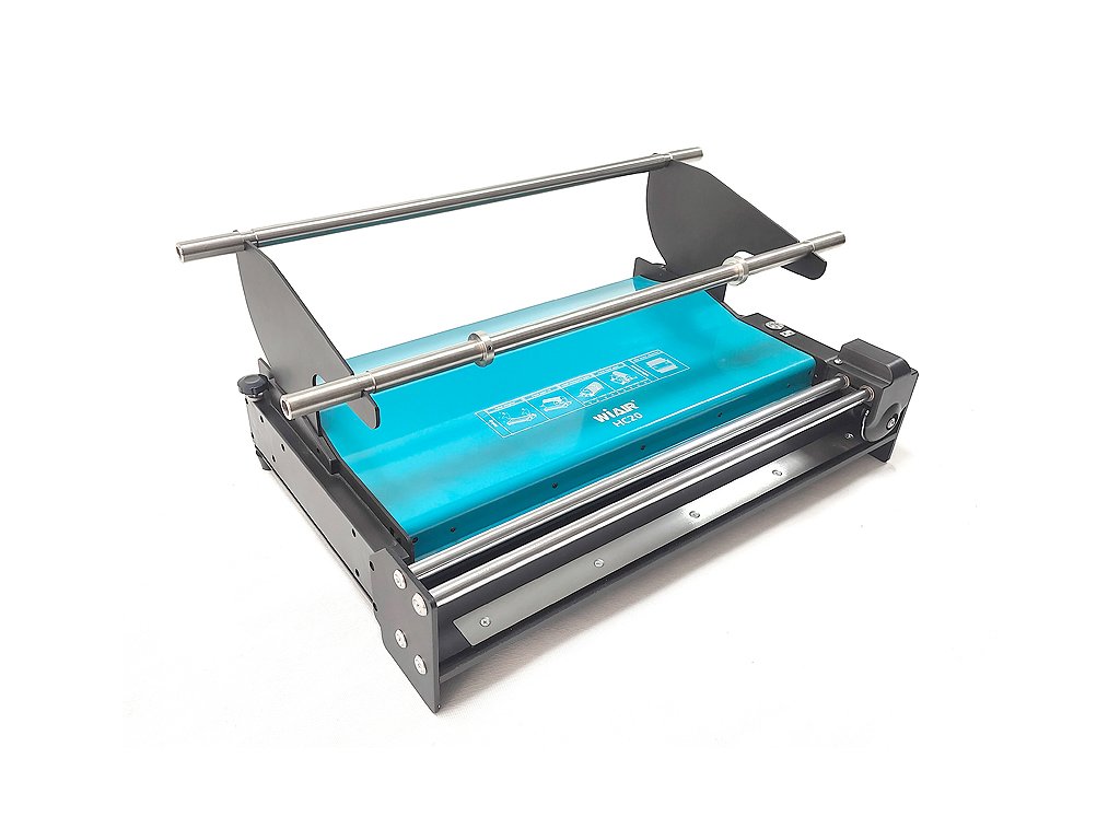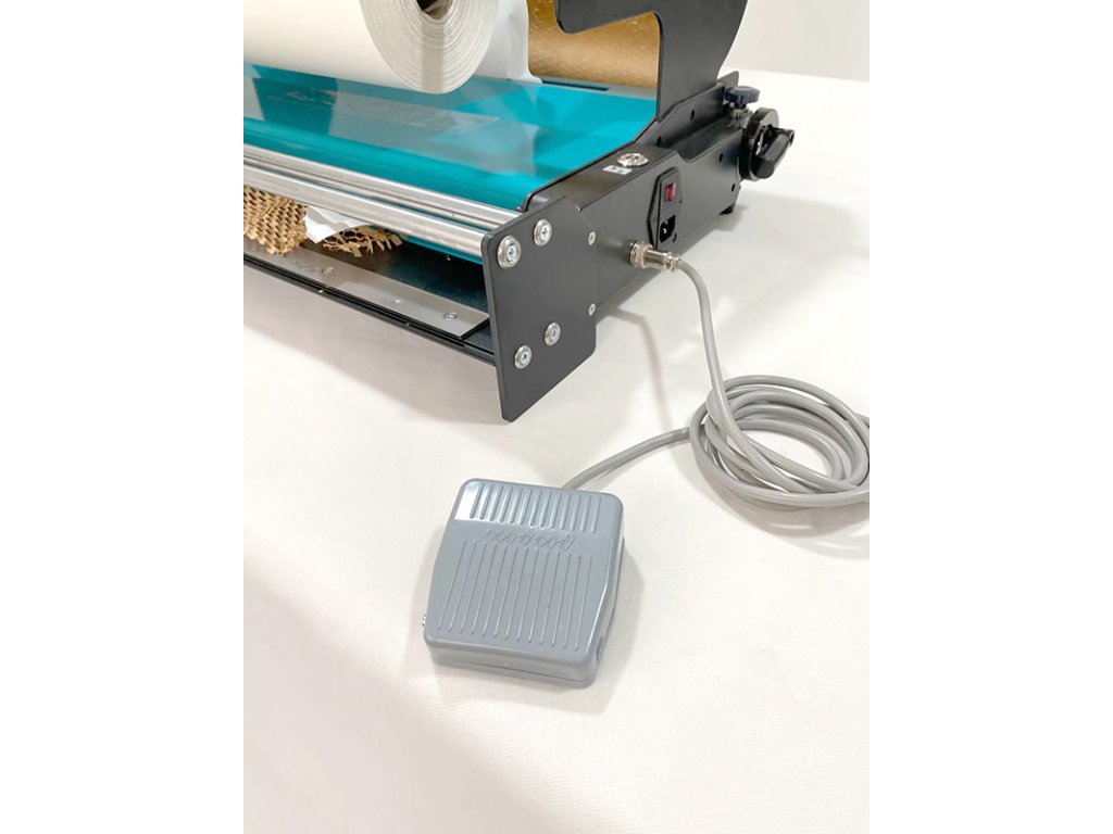Součástí stroje je nožní pedál, kterým si uživatel odvíjí balící materiál dle potřeby.