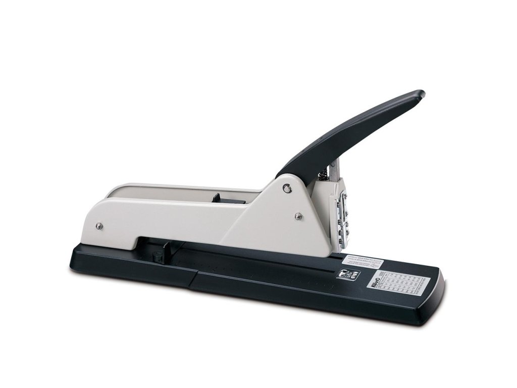 Výkonná bloková sešívačka s kapacitou až 200 listů s ramenem dlouhým 25 cm schopným sešít A3 uprostřed.