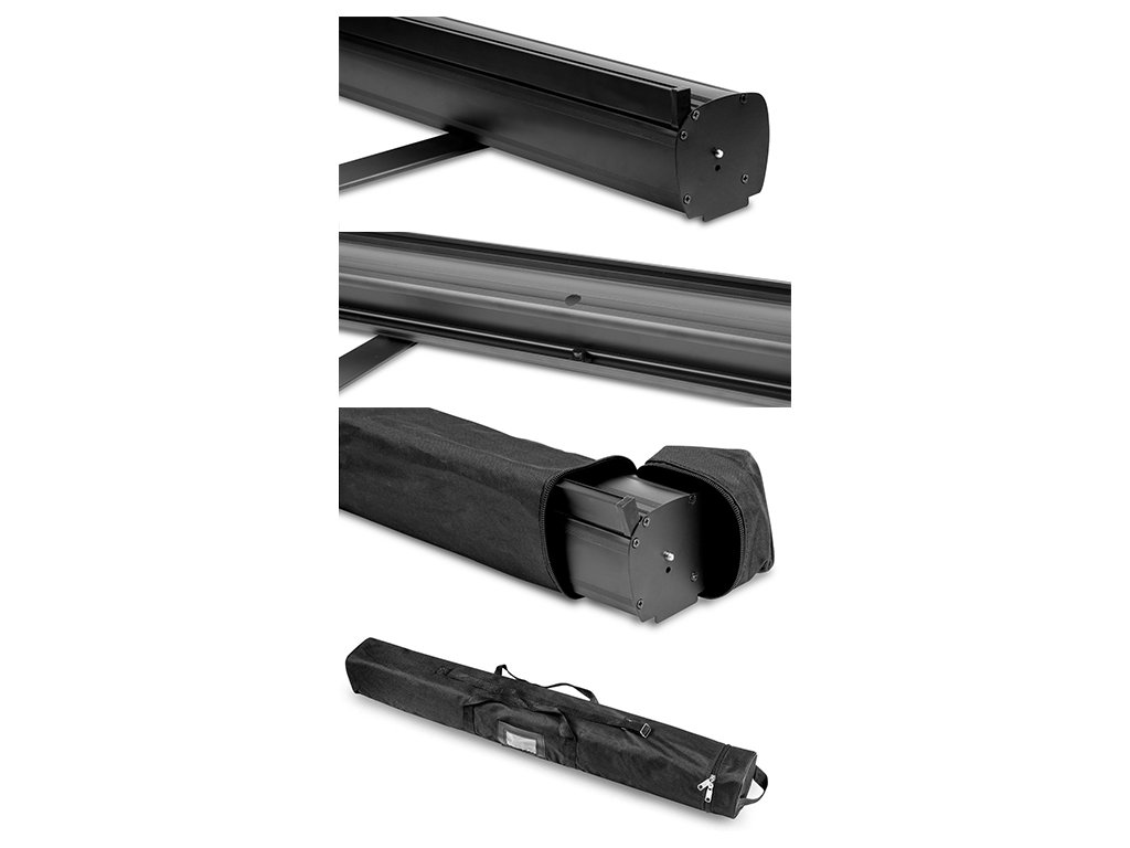 - Tato sada obsahuje: standardní černou svinovací kazetu, jednu tyč, horní lištu "Express Clip", lepicí pásku 3M, přenosnou tašku s kapsou na vizitky a samostatnou kartonovou krabici.