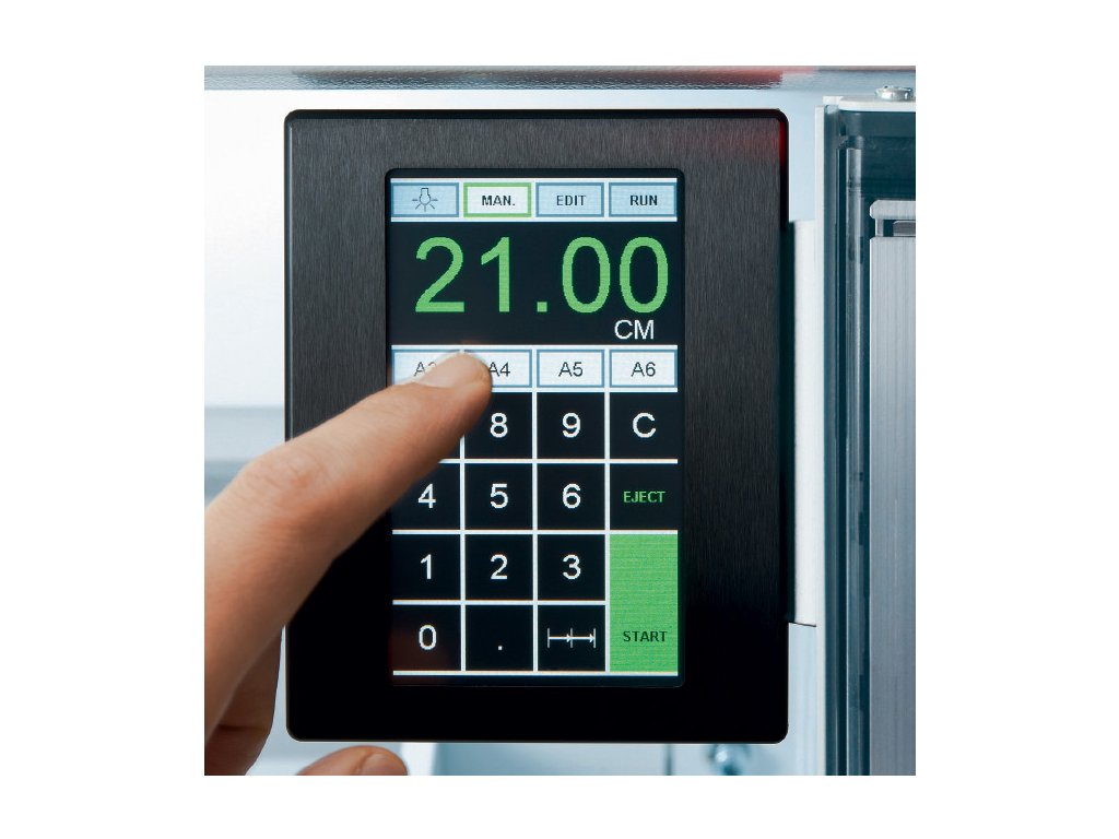 Stohová řezačka inovované řady IDEAL s délkou řezu 520 mm. Uživatelsky přívětivé ovládání, standardně vysoké zabezpečení proti úrazu. Pro zvýšení bezpečnosti je stroj opatřen LED světelným rámem. Optimální výška stolu umožňuje snazší obsluhu, nehcybí automatický přítlak, dotykový displej a bezpečnostní LED rám.