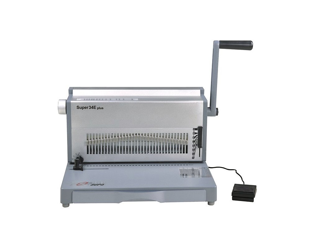 Elektrický děrovací a vázácí stroj pro drátěnou vazbu 3:1 Super 34E . S délkou perforace 300 mm a tloušťkou perforovaného materiálu až 28 listů 80 g. Manuální integrovaný zavírač drátěnné vazby s nastavením jednotlivých průměrů. Možnost vyřazení libovolného děrovacího segmentu. Nastavení hloubky dorazu. Měřítko pro doporučení velikosti drátu. Díky otevřeným bočnicím lez děrovat i vázat na dvakrát i větší formáty.