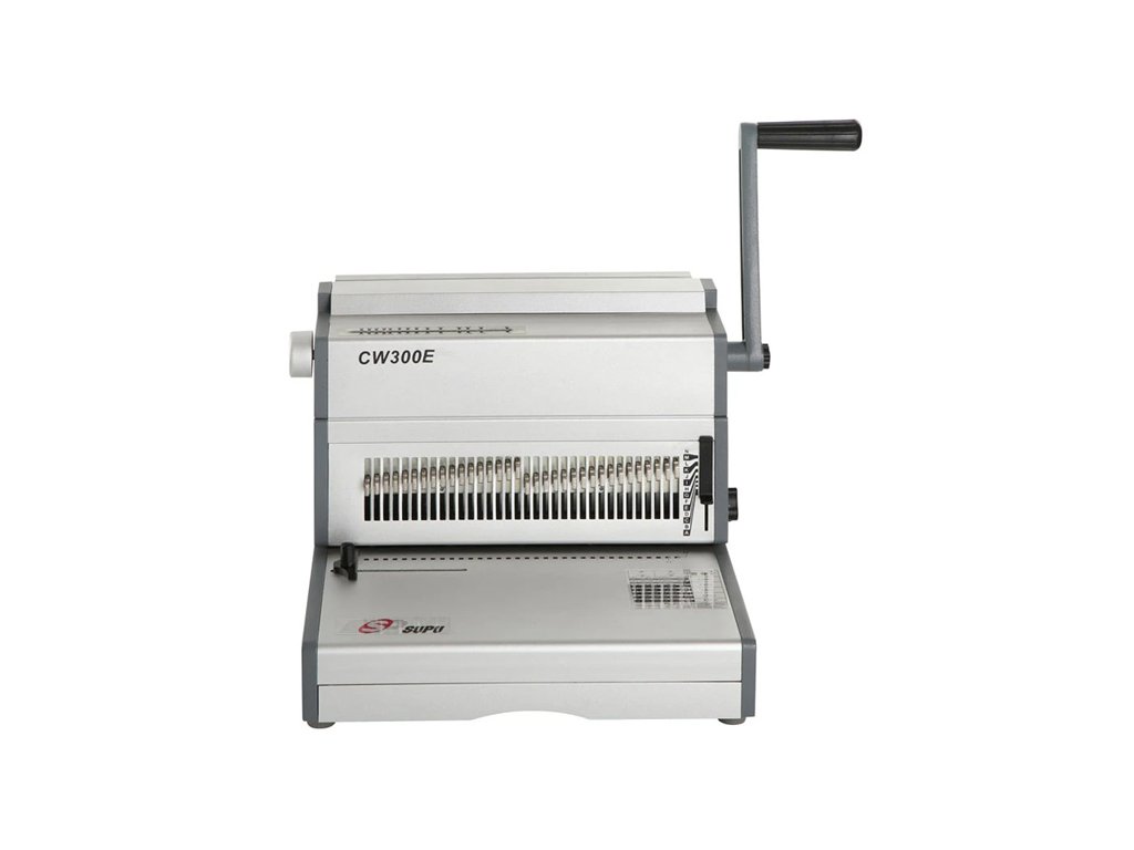 Elektrický děrovací a vázácí stroj pro drátěnou vazbu 3:1 Super CW300E. S délkou perforace 300 mm a tloušťkou perforovaného materiálu až 30 listů 80 g. Manuální integrovaný zavírač drátěnné vazby s nastavením jednotlivých průměrů. Možnost vyřazení libovolného děrovacího segmentu a nastavení hloubky dorazu. Měřítko pro doporučení velikosti drátu. Díky otevřeným bočnicím lez děrovat i vázat na dvakrát i větší formáty.