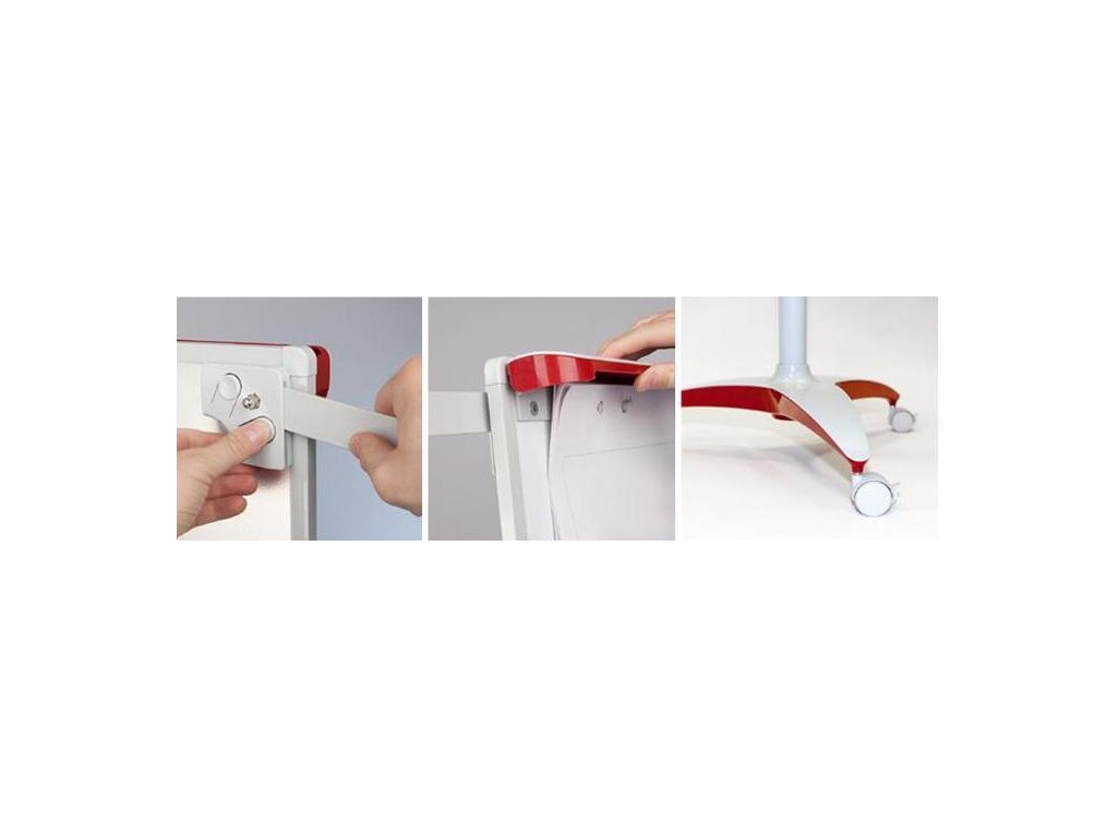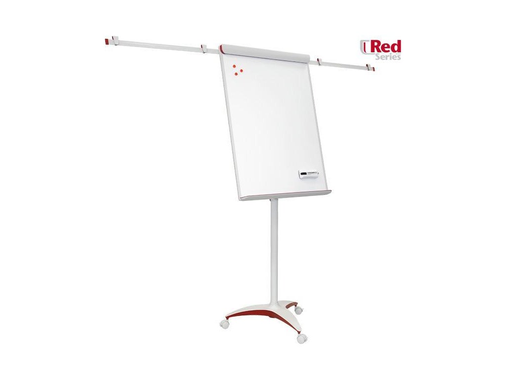 Kvalitní designový mobilní flipchart s červenými doplňky.