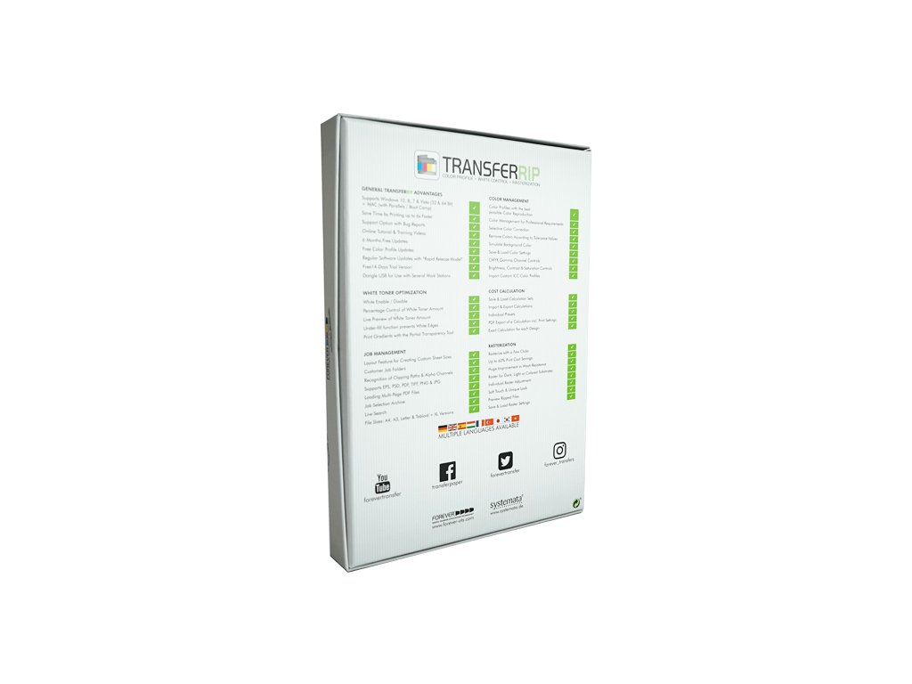 Software TransferRIP hraje hlavní roli při zlepšování ovládacích prvků správy barev, ovládacích prvků bílého toneru a rastrování. Tyto možnosti jsou velmi výkonné funkce, které snižují celkové náklady na toner, zvyšují trvanlivost a zlepšují opratelnost a vytvářejí mnohem jemnější pocit na dotek přenosených motivů - ve srovnání s jinými digitálními přenosy na trhu.