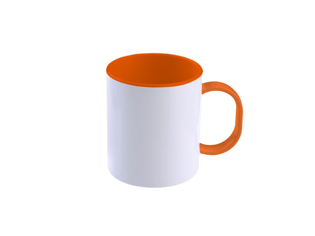 Hrnek bílý s barevným vnitřkem a uchem v barvě oranžové - vyrobený ze sublimačního polymeru vypadá docela podobně jako běžný keramický hrnek na kávu, přesto je zcela bez sublimačního povlaku. Tento hrnek je vyroben z polymerového materiálu šetrného k barvivům sublimační barvy s vysoce lesklým povrchem a ultra bílé tělo hrnečku.