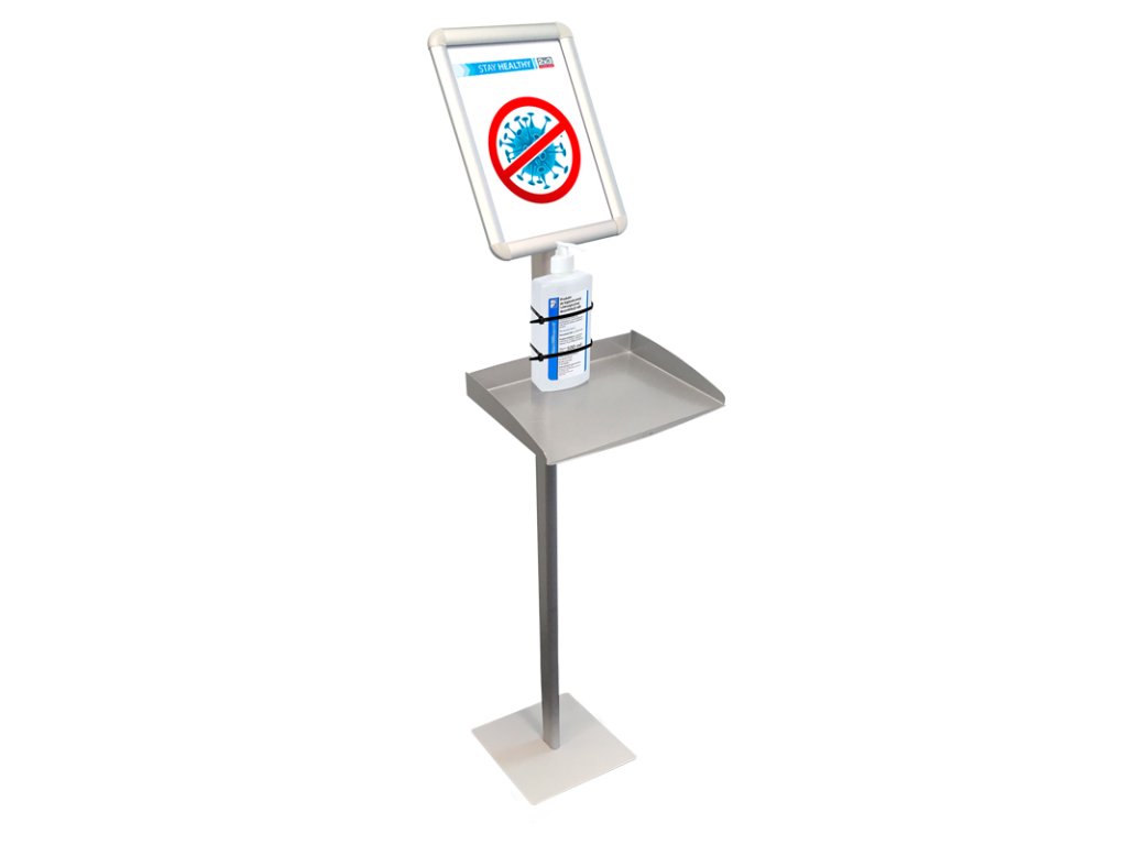 Stojan je stabilní a funkční a nabízí možnost umístitění jakékolii informační grafiky do clip rámu. Dále lze nabízet dezinfekční kapalinu na polici a ochranné rukavice pověšené na háčcích.