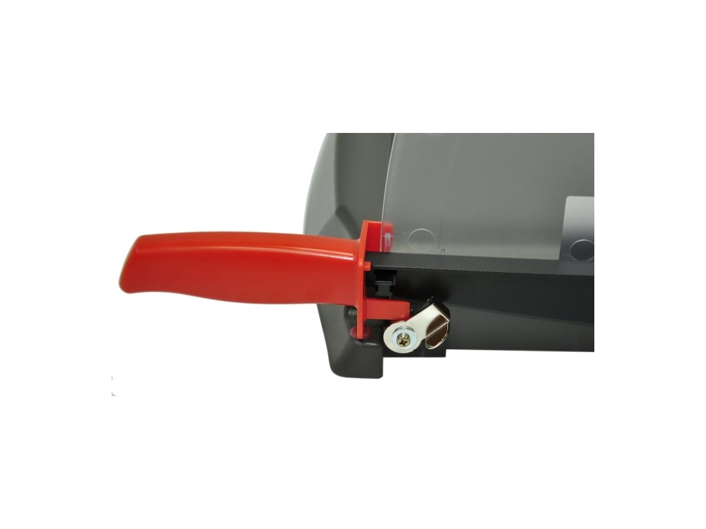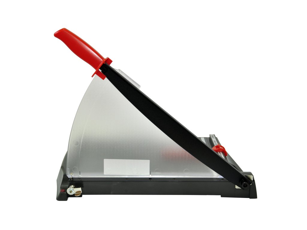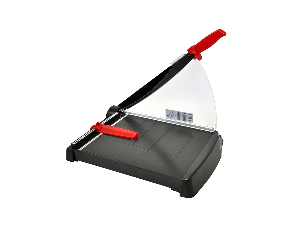 S plastovým ochranným krytem, s plastovým stolem s vyznačenými měřítky a DIN formáty, s posuvným dorazem papíru.