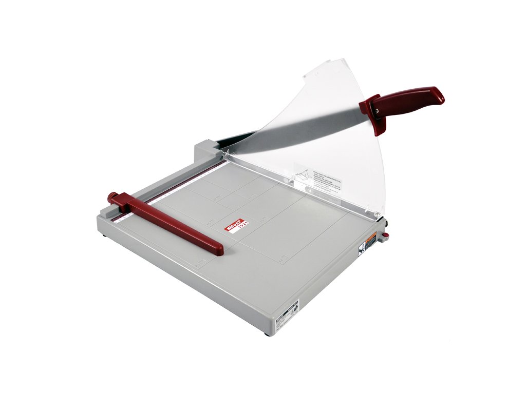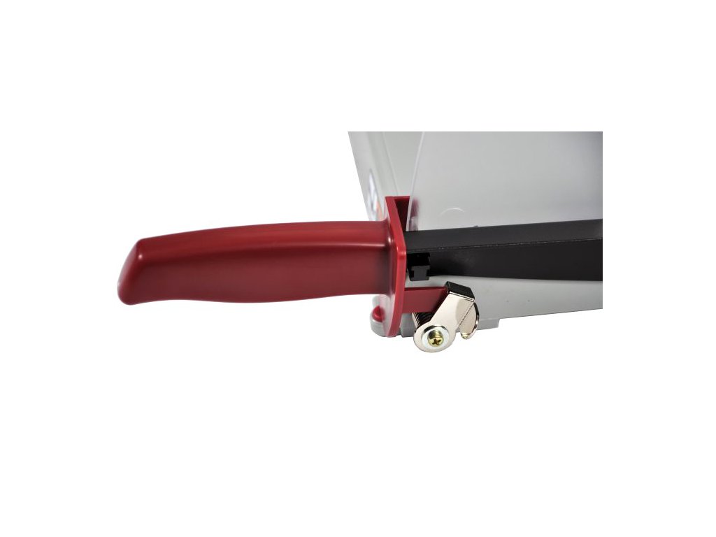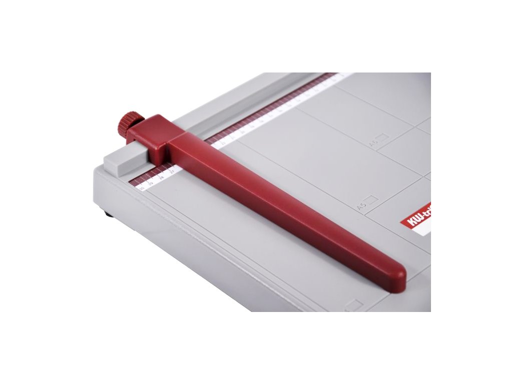 Hobby páková řezačka A4 s plastovým ochranným krytem a plastovou základnou s oděruvzdorným povrchem ABS, s vyznačenými měřítky a DIN formáty a posuvným dorazem papíru se šroubovou aretací.