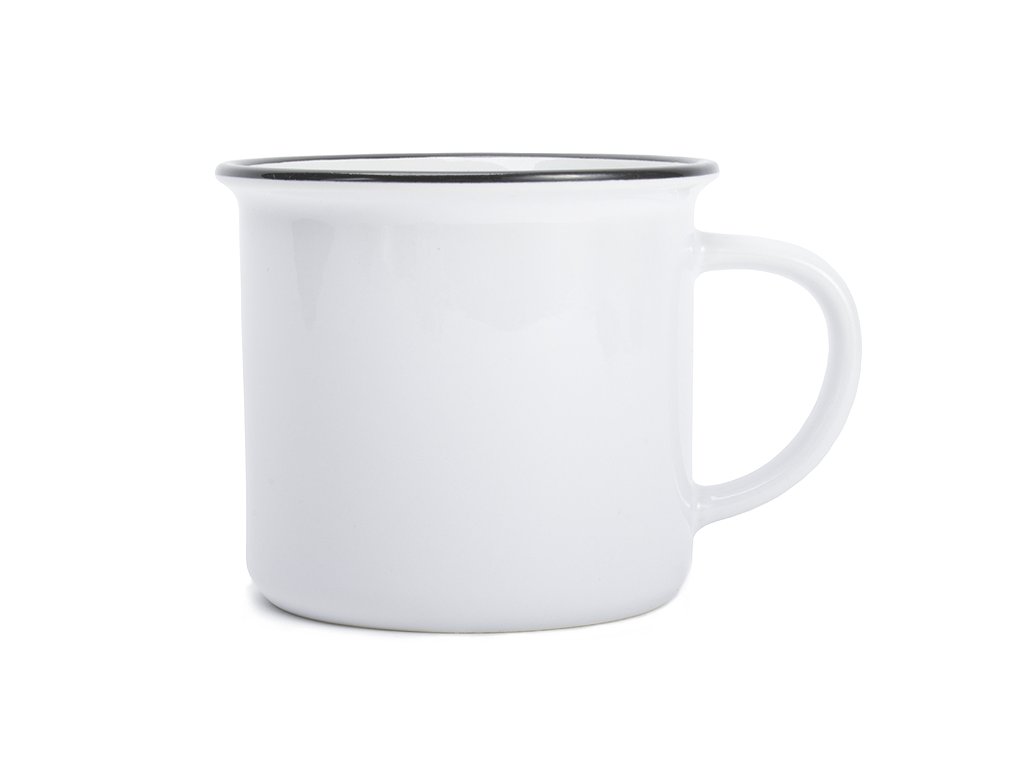 Keramický bílý hrnek s černým lemem v designu imitujícím populární plecháčky. Kvalitní coating zaručující 3000 mycích cyklů.