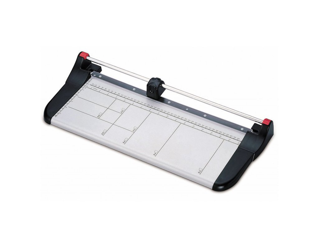Kvalitní kotoučová řezačka s pevným kovovým stolem, určena pro řezání dokumentů formátu A3. Pracovní stůl je vybaven natištěnými měřítky a přítlačnou lištou z průhledného plastu. Řezačka umožňuje řezání max. 7 listů papíru najednou.