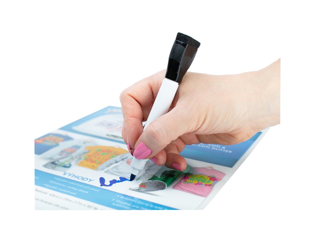 Lesklé laminovací fólie vhodné pro popisování suchými popisovači. Součástí balení je oboustranný dvoubarevný popisovač s praktickou houbičkou.