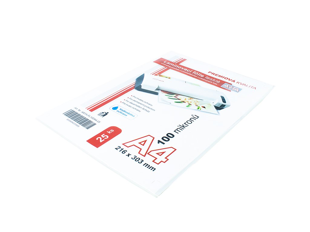 Formátové laminovací fólie ARTA ve formátu A4 a síle 100 mic. Baleno po 25 kusech. Ideální řešení pro domácnosti a malé kanceláře.