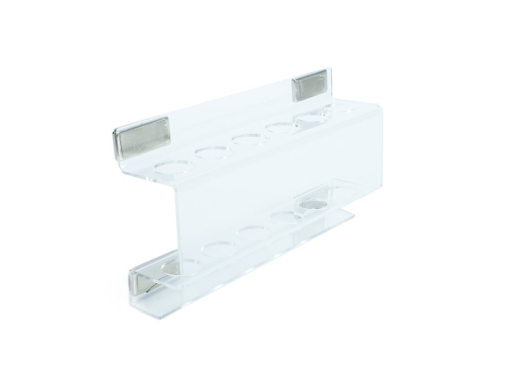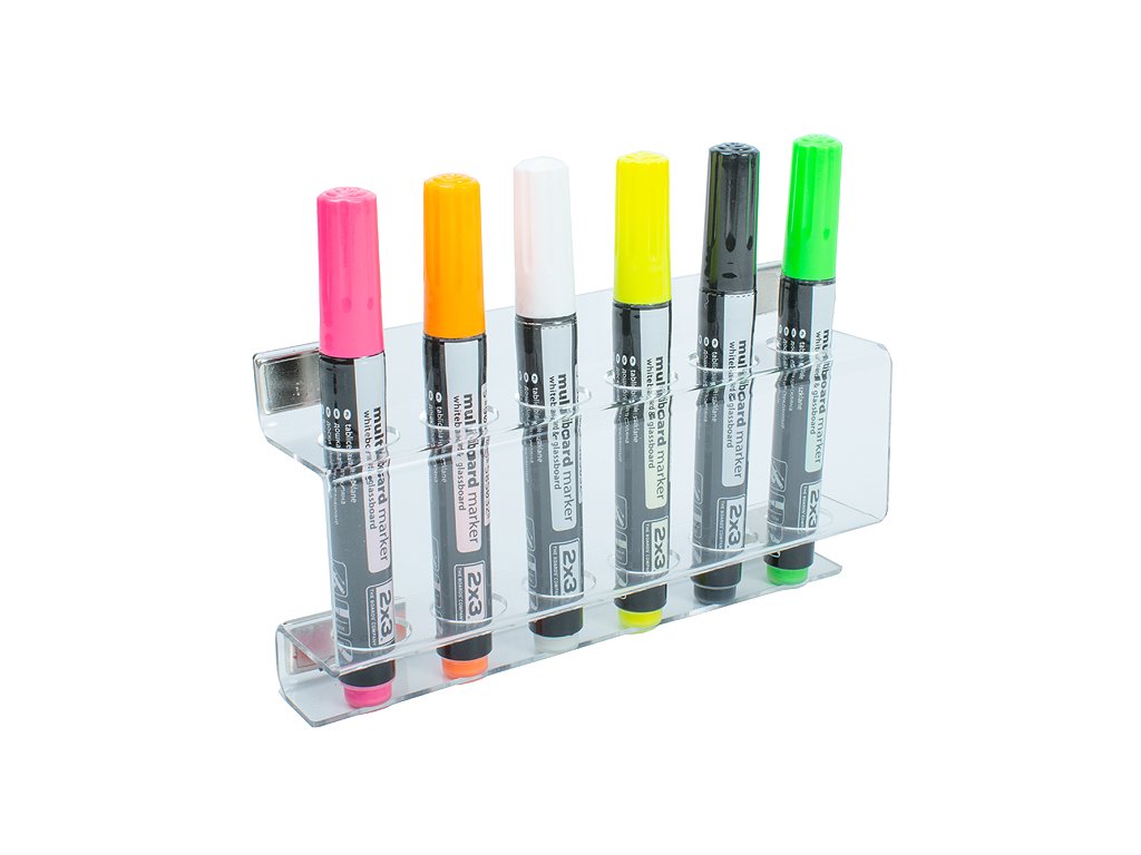 Universální držák na 6 popsiovačů různých průměrů do max. 21 mm. Vhodné pro skleněné tabule. Dostatečně silná neodymová magnetická podložka zajišťuje držák na místě i u skleněných tabulí.