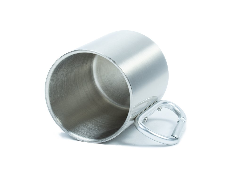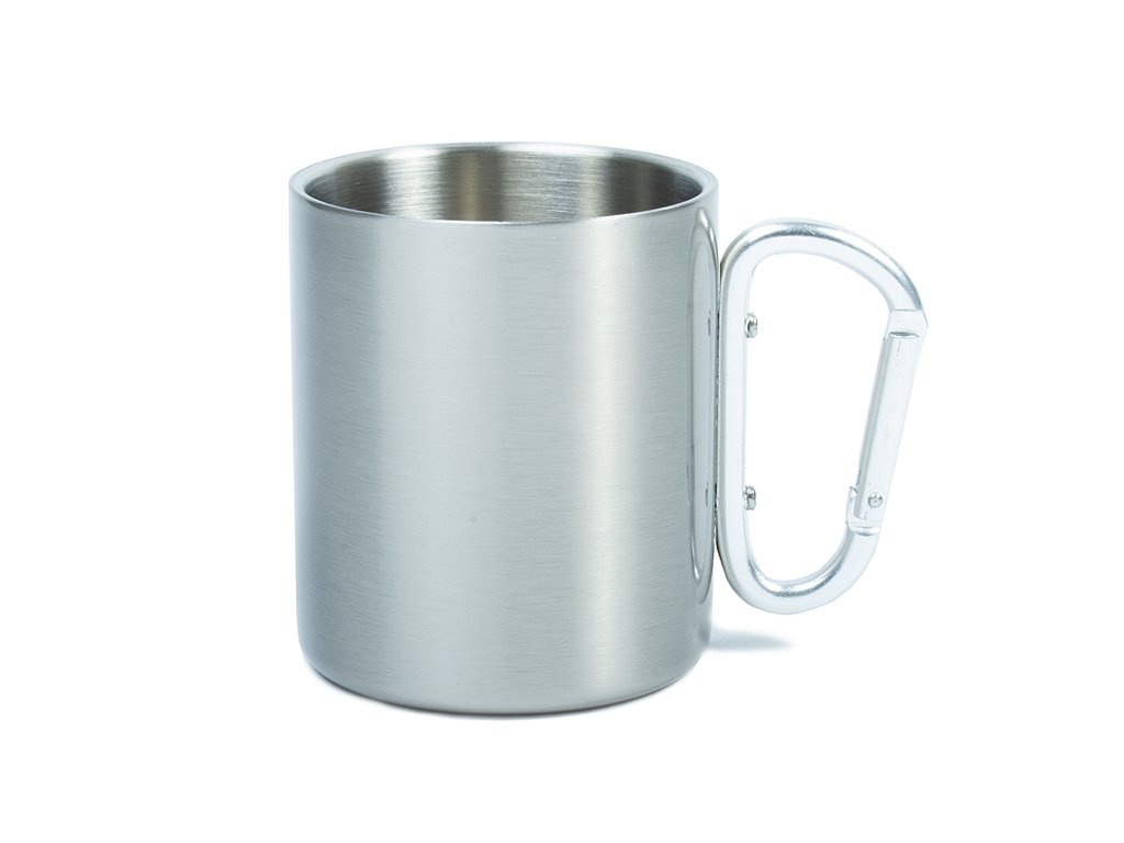 Nerezový dvouplášťový hrnek se stříbrnou rychloupínací karabinou. Ideální pro outdoorové aktivity.