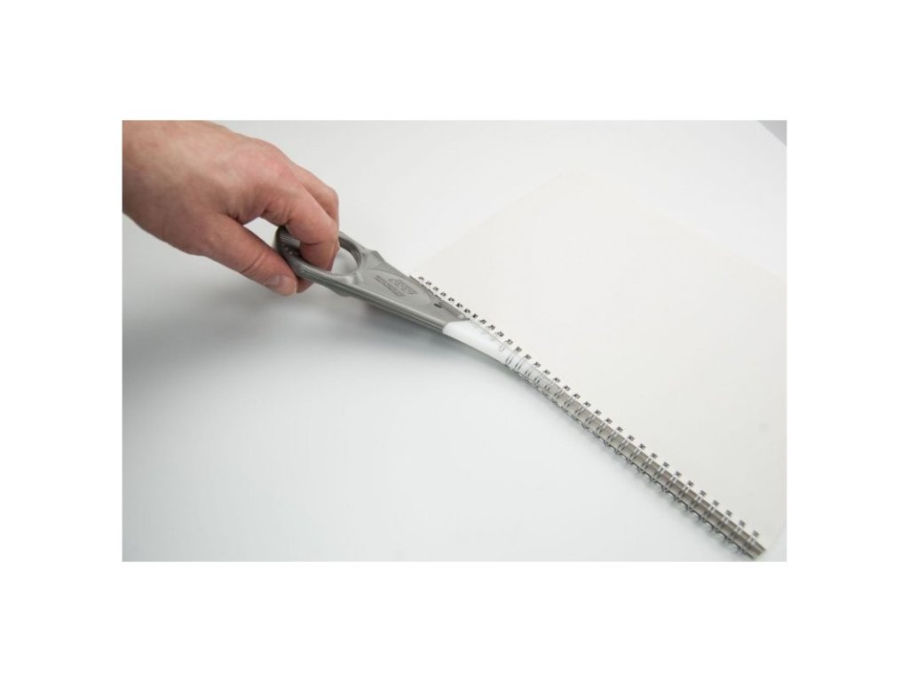 Spolehlivý a snadno použitelný otvírač drátěné vazby pro všechny druhy drátěných vazeb. Otevře 3:1 i 2:1 vazbu jakékoli délky bez rizika poničený svázaných dokumentů.