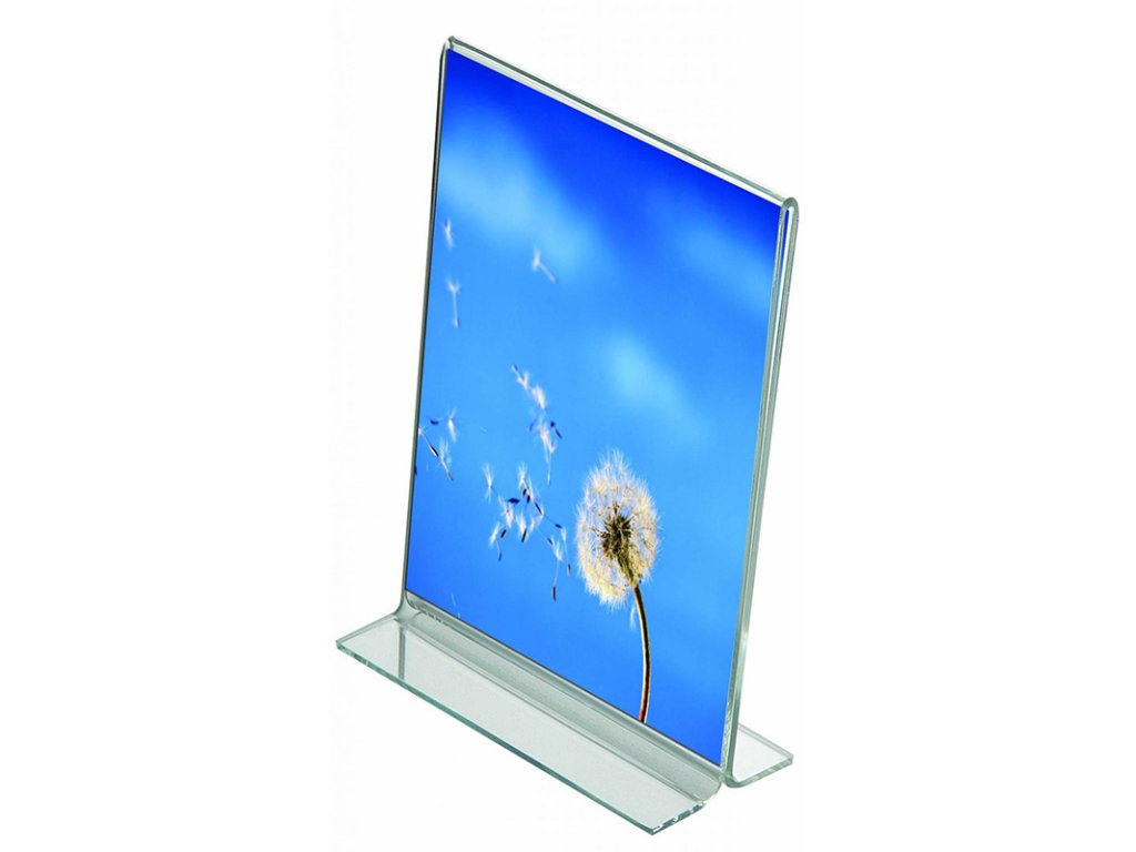 Kvaltiní stojánek z čirého plexi na stůl vhodný pro vložení letáku, menu, ceníku... - oboustranný typu T - velikost A4 umístění na výšku
