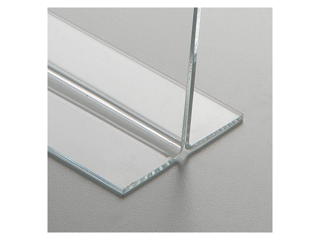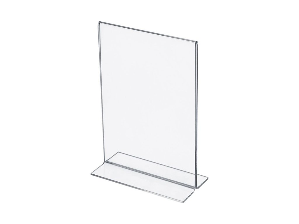 Kvaltiní oboustranný stojánek typu T z čirého plexi na stůl vhodný pro vložení letáku, menu nebo ceníku.