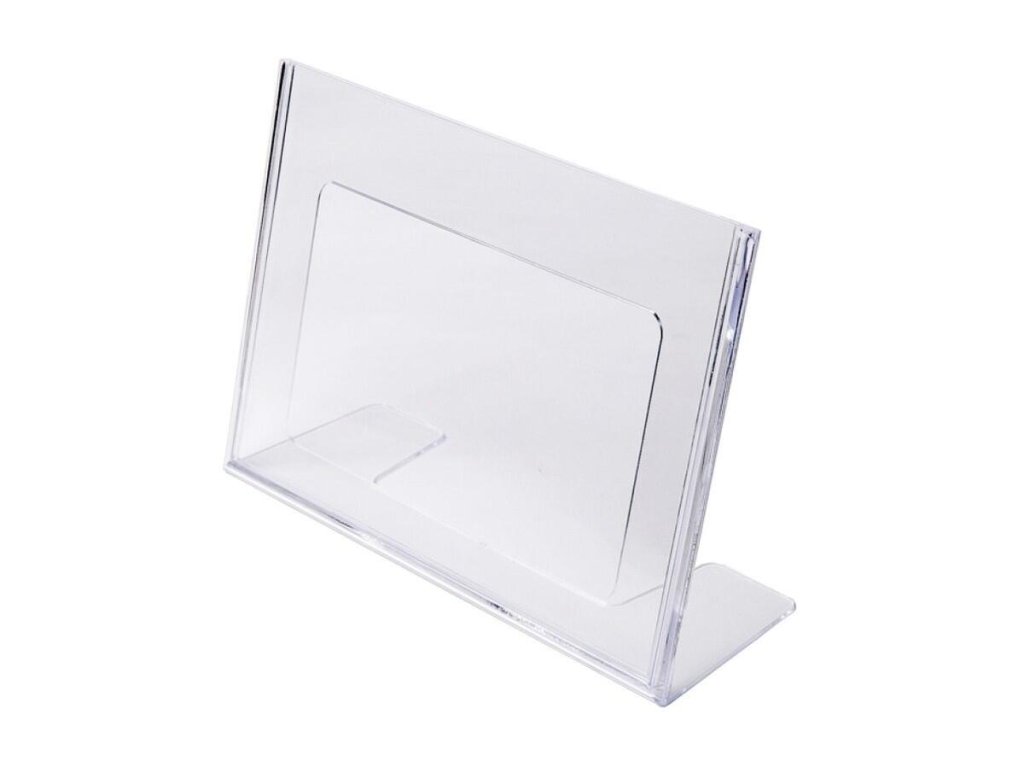 Kvalitní stojánek jednostranného typu L z čirého plexi na stůl vhodný pro vložení letáku, menu či ceníku. Velikost A5 umístění na šířku.
