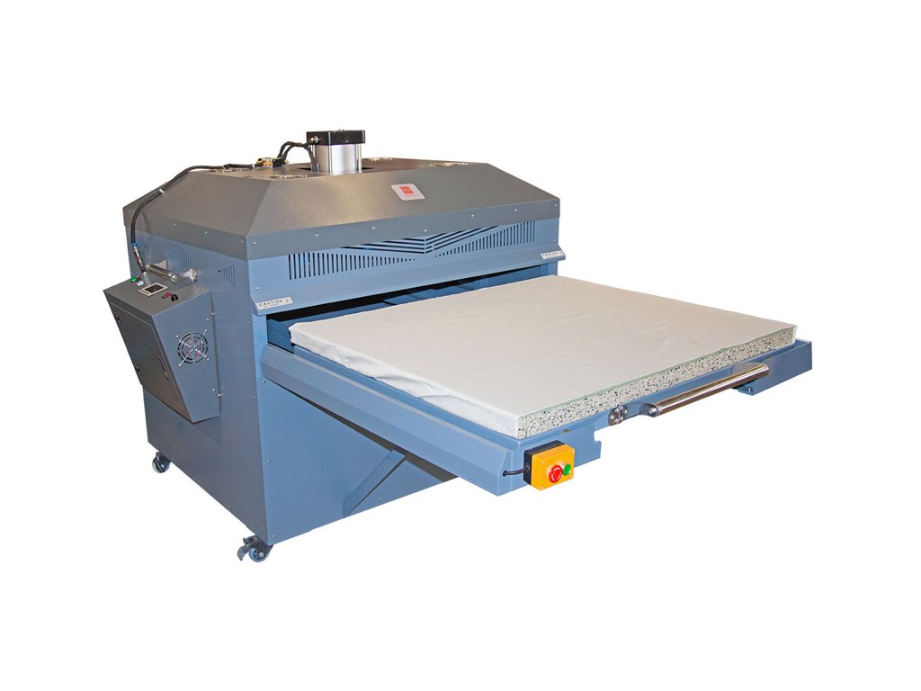 - Velká plocha jednoho stolu o rozměrech 100 cm x 120 cm, s posuvným spodním stolem. Ideálně se hodí pro tisk větších oděvních panelů, jako jsou sportovní oděvy, vlajky, čalounění a tvrdé značení