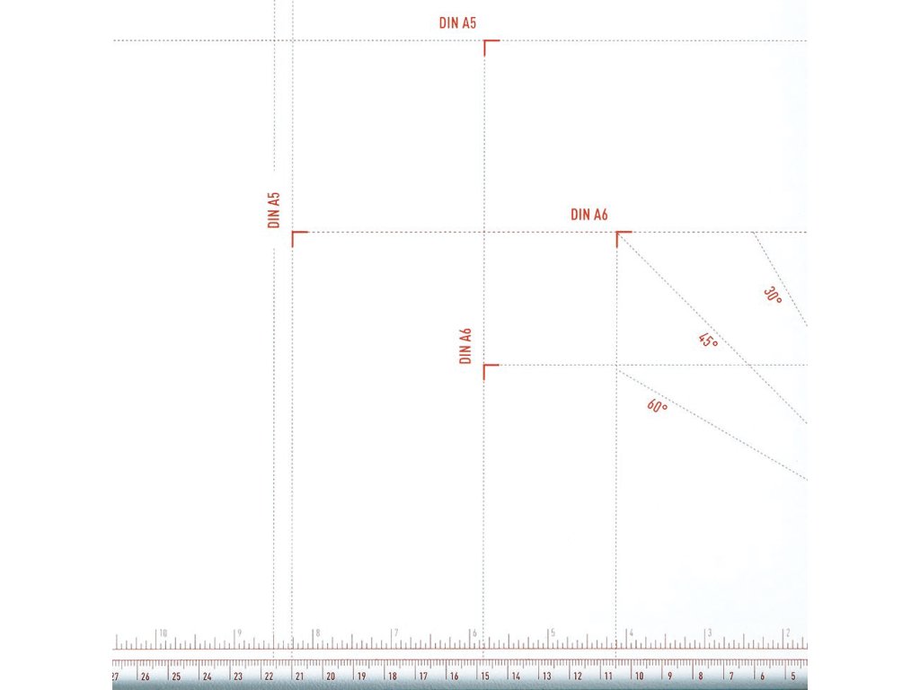- Standardní velikosti papíru od A6 do A3 + formát 3, americké velikosti (letter, legal, velikosnihy) a různé úhly vytištěné na stole.