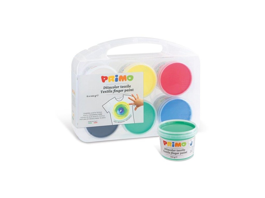 Prstové barvy na textil PRIMO, sada 6 x 100g, kelímky, PP box