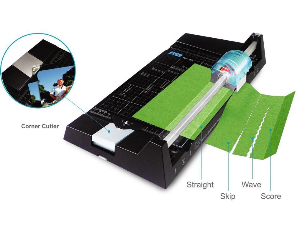 Pouze otáčením kolečka průhledné řezací hlavy se mění typ řezu na rovný, vlnkový, dírkovaný (perforace), nebo lze i rýhovat.
