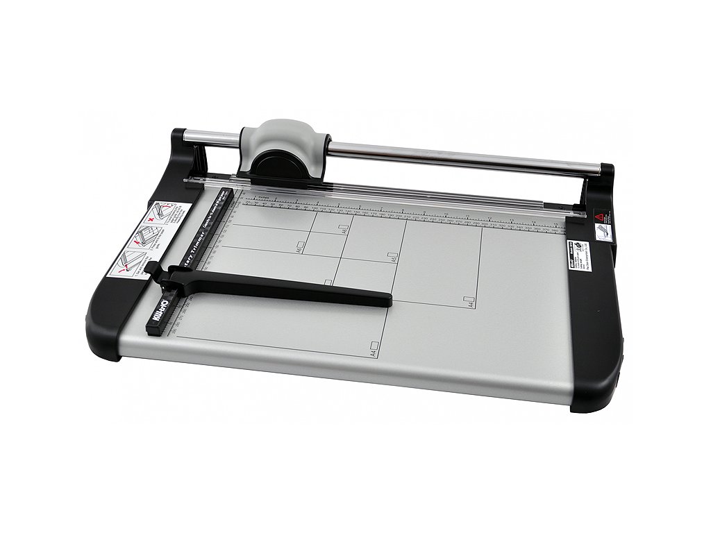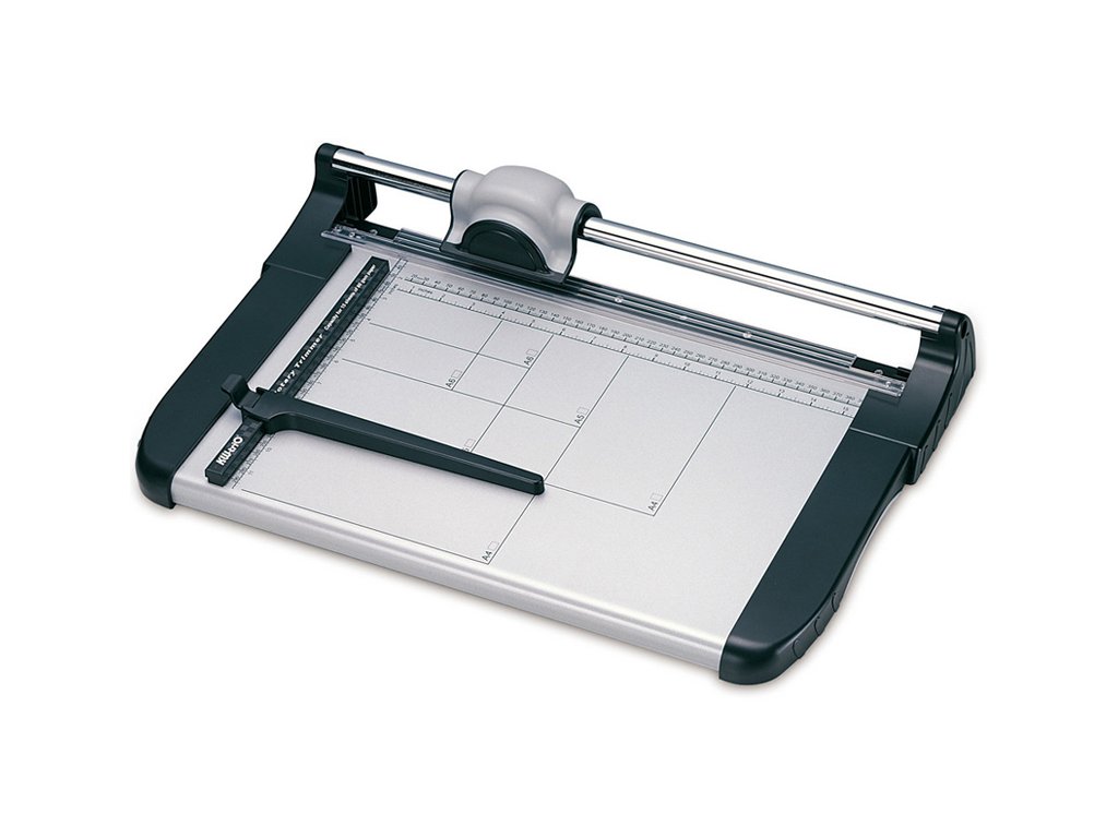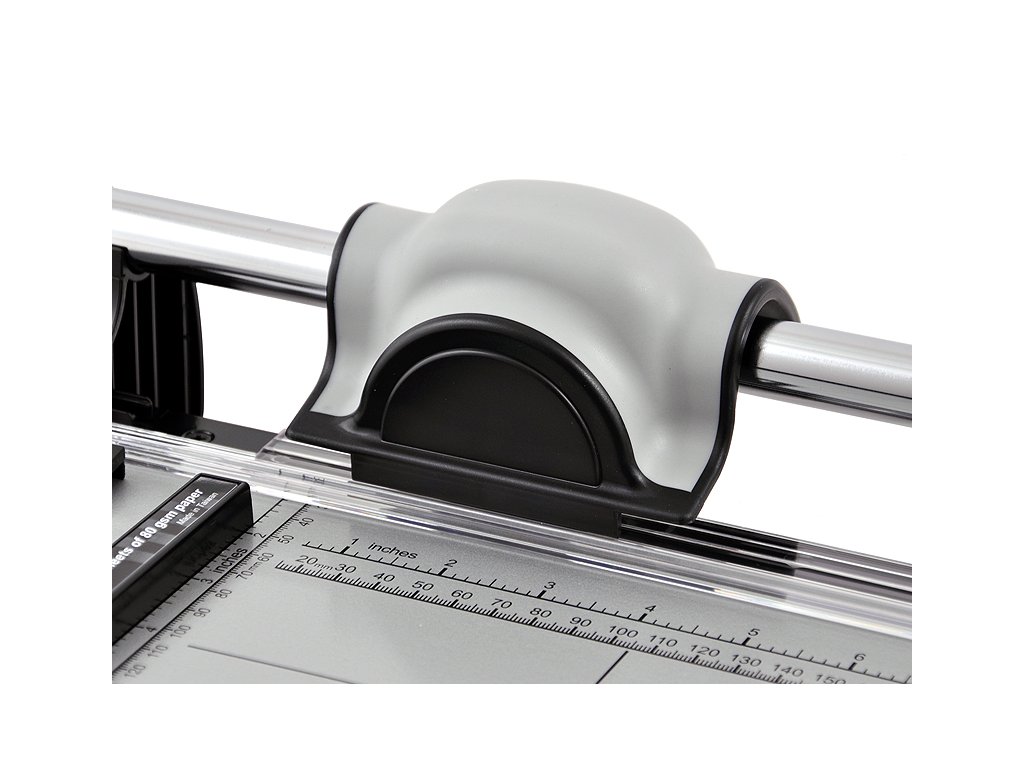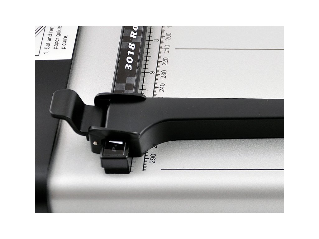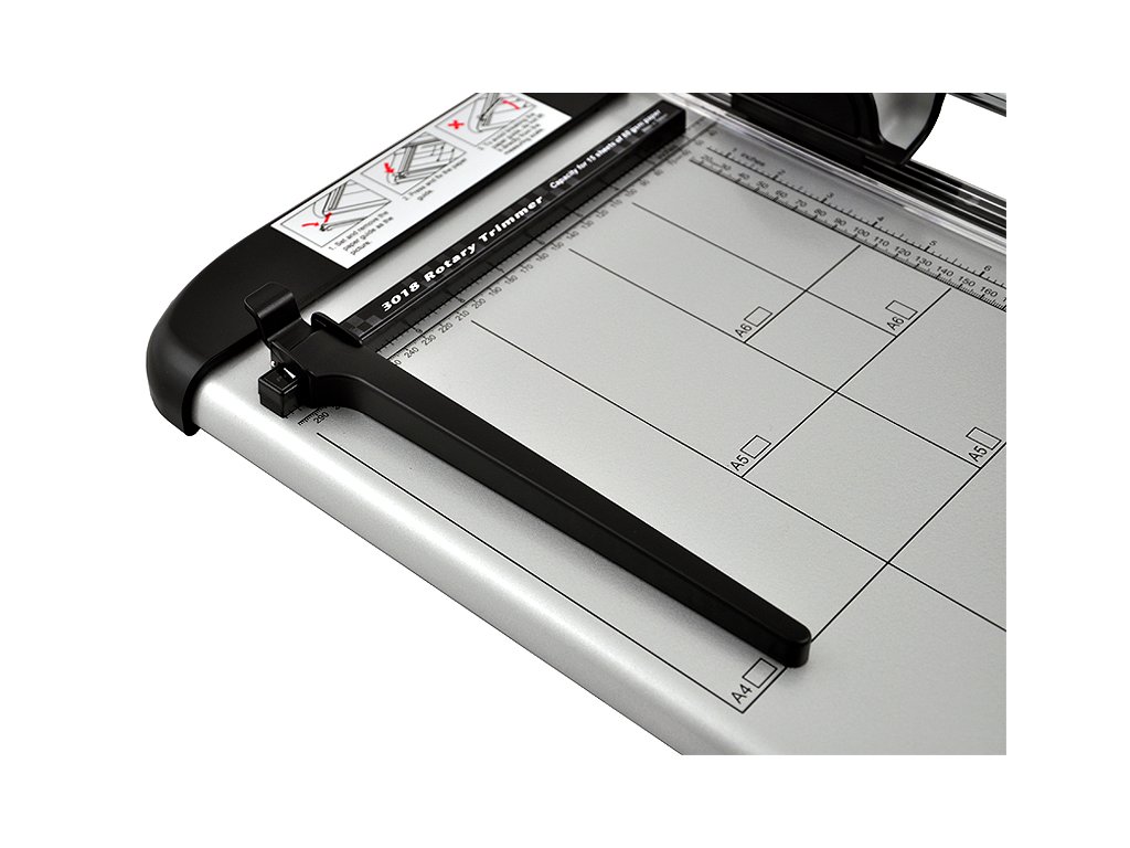Základna je vybavena natištěnými měřítky a posuvnou zarážkou souběžnou s přímkou řezu.