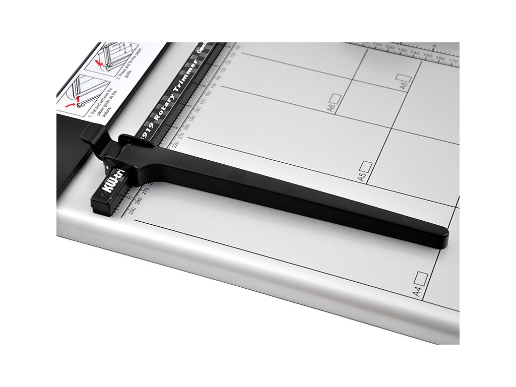 - Základna je vybavena natištěnými měřítky a posuvnou zarážkou souběžnou s přímkou řezu.