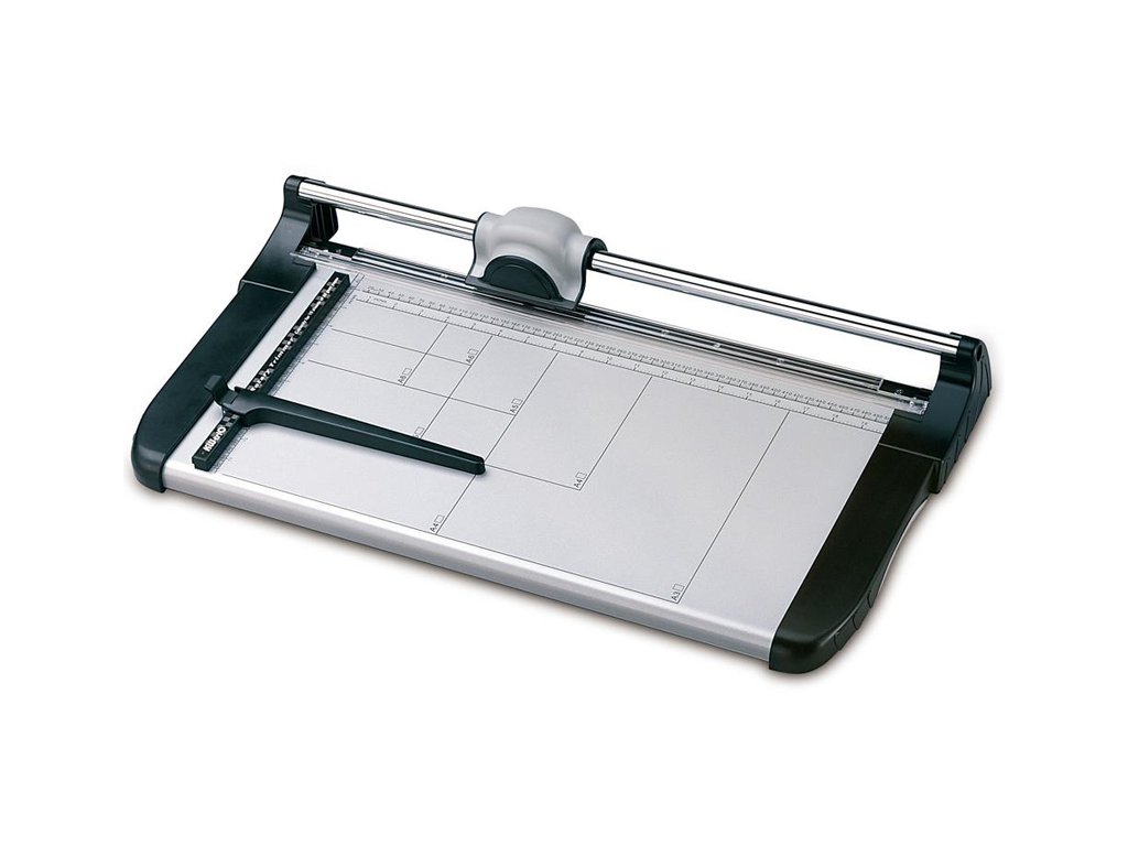 Kvalitní kotoučová řezačka s pevnou kovovou základnou, řeznou hlavou umístěnou na kovové tyči a nastavitelným dorazem s aretací.