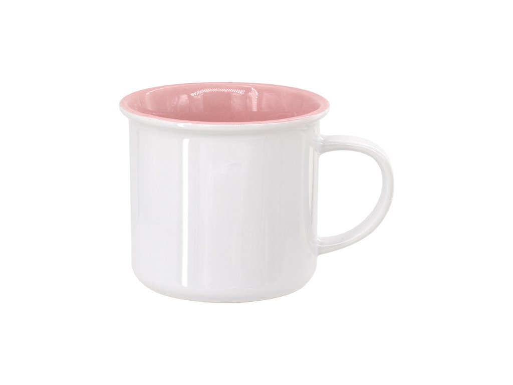Keramický bílý hrnek s ružovým vnitřkem v designu imitujícím populární plecháčky. Kvalitní coating zaručující 3000 mycích cyklů.