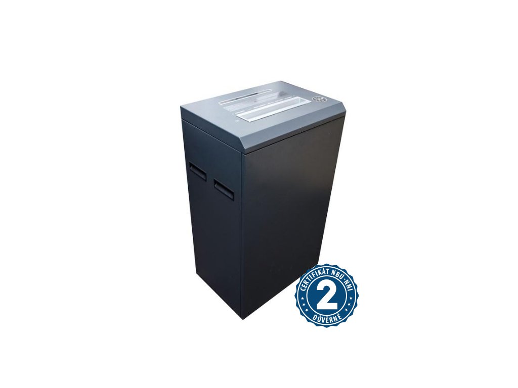 Robustní skartovací stroj praktického designu v kompletním plechovém provedení, s příznivým poměrem cena/výkon.