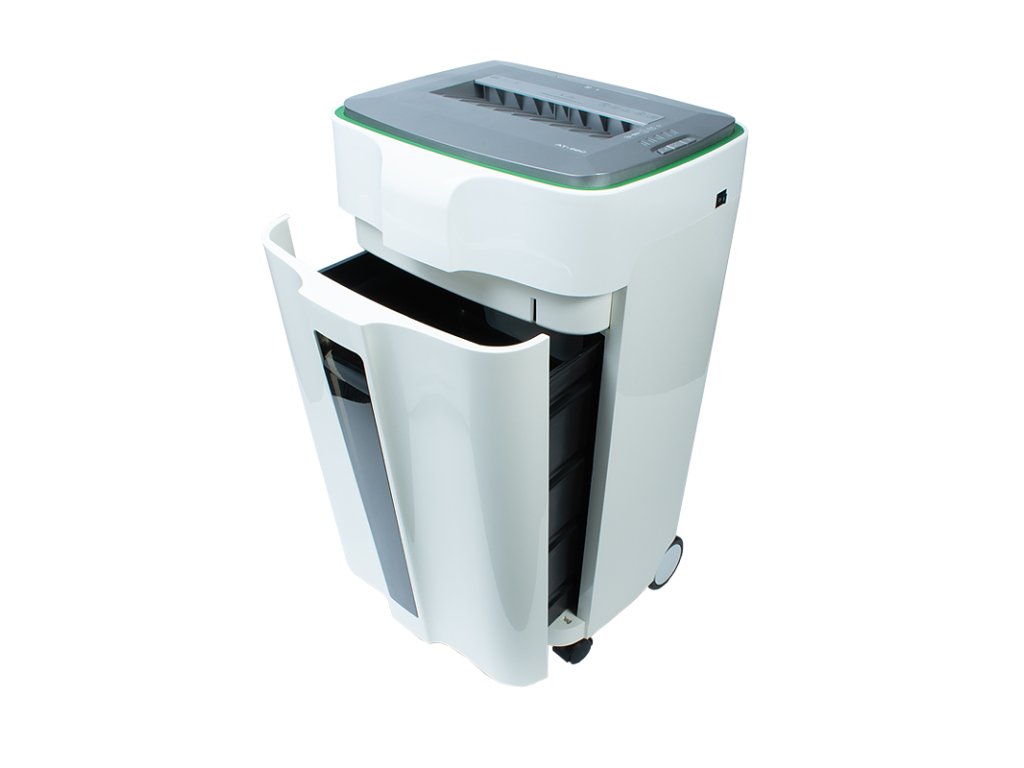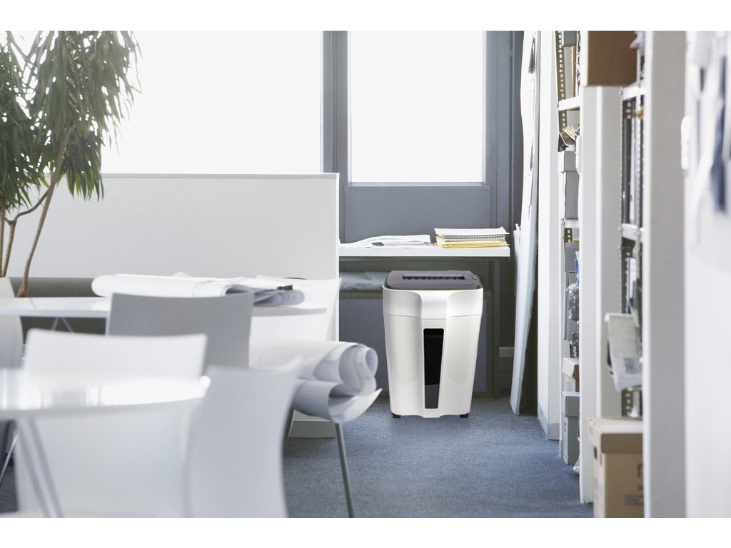 Bílý design s čistými liniemi působí moderně a elegantně. Díky kolečkům lze skartovačku snadno přesouvat mezi kancelářemi nebo místnostmi podle potřeby.