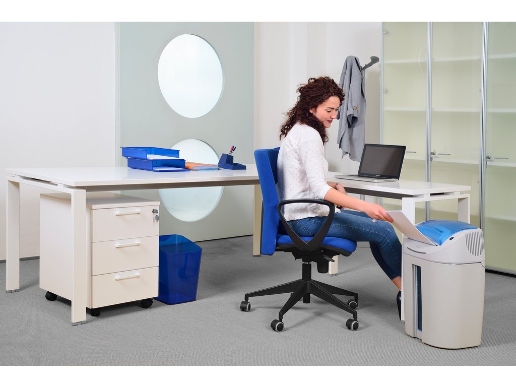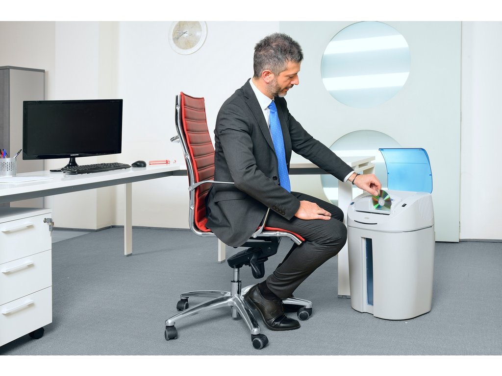 Skartovač je vybaven systémem Energy Smart s účinným opticky osvětleným indikátorem pro úsporný pohotovostní režim a ochranu životního prostředí. Dále automatickým Start&Stopem, bezpečnostním zastavením a automatickým zpětným chodem v případě zaseknutí. Dva samostatné integrované vyjímatelné koše nevyžadují plastové sáčky: Koš na papír o objemu 38,5 litru a koš na plast o objemu 1,5 litru. Nechybí ani přední průhledné okénko pro kontrolu naplnění odpadního koše. Vyprazdňování koše je snadné díky tomu, že nevyžaduje zvedání řezací hlavy.