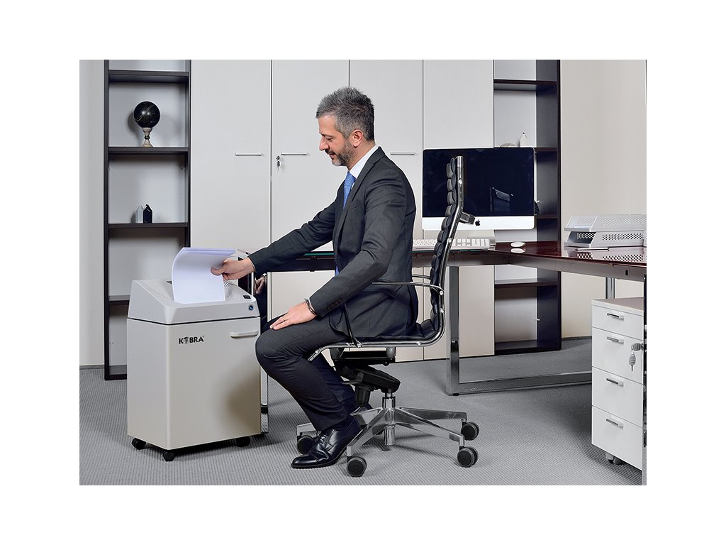 Skartovačka je vybavena systémem Energy Smart, úsporným režimem stand-by po 8 sekundách nečinnosti, automatickým Start&Stopem a automatickým zpětným chodem v případě zaseknutí. Systém Safety stop detekuje otevření dveří a automaticky zastaví řezací nože, 40 litrová skříň je umístěna na kolečkách. Otočným úchytem na boku odpadní nádoby lze manipuloat se separační deskou pro oddělení odpadu ze skartovaných CD/DVD a kreditních karet od papíru.