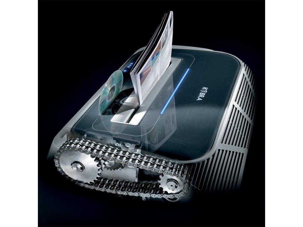 Stroj disponuje dvěma samostatnými sadami řezacích nožů. Jedna na papír a druhá na CD/DVD/kreditní karty. Dva samostatné integrované vyjímatelné koše pro oddělení skartovaného papíru od plastových útržků. Skartovat lze i průhlednou fólii. Stroj je vybaven EPC (elektronická regulace výkonu) pro optimalizaci skartování bez zaseknutí, systémem Energy Smart a automatické odpojení od sítě pro maximální úsporu energie a automatickým Start&Stopem. Nechybí bezpečnostní zastavení při otevření dvířek a/nebo plném odpadním vaku a automatický zpětný chod v případě zaseknutí. Skříň o objemu 110 litrů je umístěná na kolečkách.