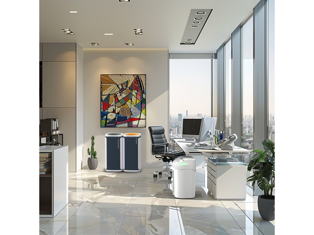 Praktickou 40 litrovou nádobu lze vyjmout bez zvedání řezací hlavy, má průhledné osvětlené přední okénko pro kontrolu naplnění odpadního koše, nevyžaduje plastové sáčky. Zařízení Safety Stop detekuje vytažení koše a automaticky zastaví řezací jednotku.