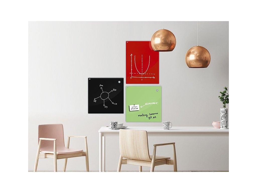 Magnetické skleněné tabule kombinují perfektní design, syté barvy a eleganci. Ideální pro kanceláře, restaurace, kuchyně, chodby, i pro obývací pokoje nebo koupelny. Jsou vyrobeny z bezpečnostního kaleného ESG skla (potištěné barvou z druhé
