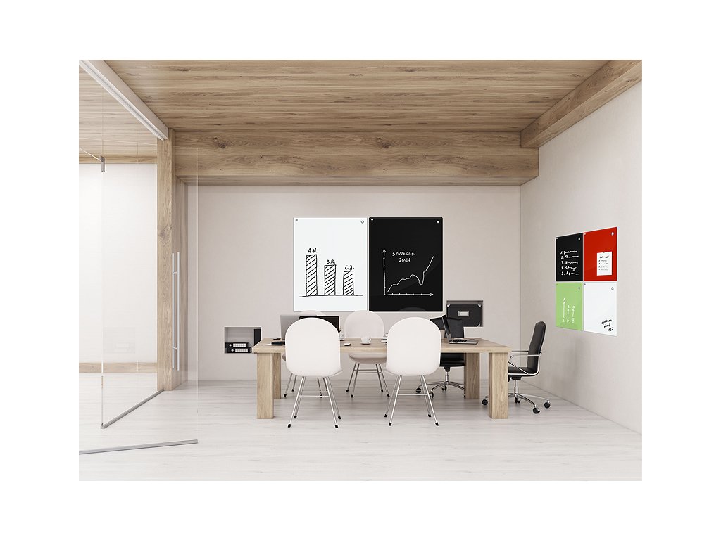 Skleněné tabule mají zaoblené rohy, které je činí bezpečnější při používání. STÍRATELNÉ vlastnosti umožňují dělat si poznámky nebo malůvky, a zase je okamžitě změnit, kdykoliv budete potřebovat.