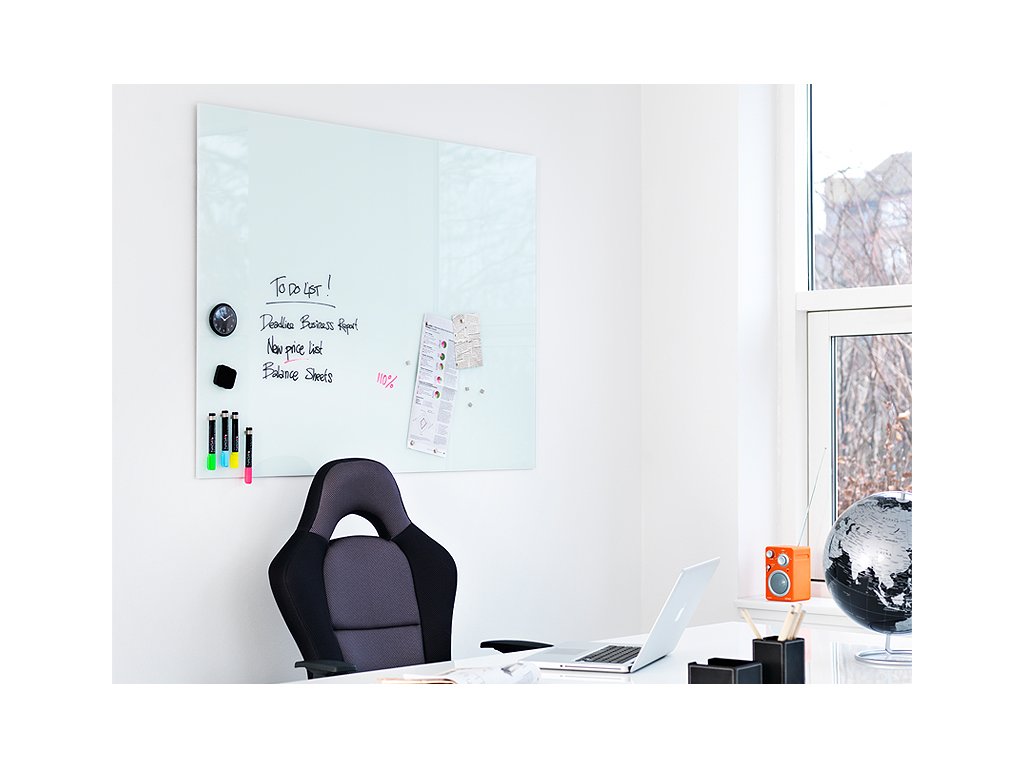 Skleněné tabule mají zaoblené rohy, které je činí bezpečnější při používání. STÍRATELNÉ vlastnosti umožňují dělat si poznámky nebo malůvky, a zase je okamžitě změnit, kdykoliv budete potřebovat.
