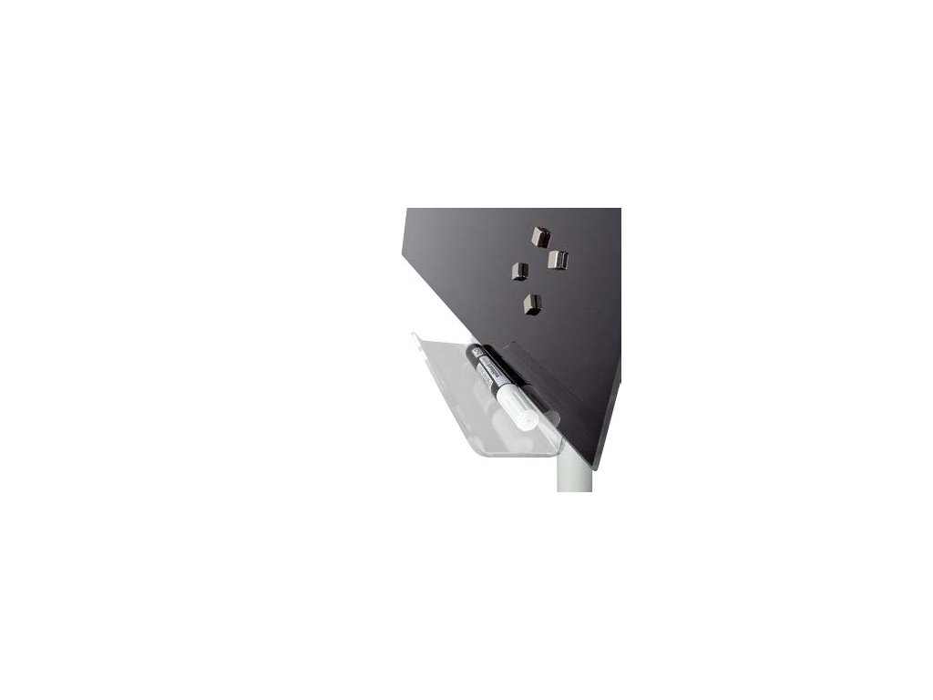 Designový flipchart s čístými hranami, průhledné trny pro připevnění bloku a průhledná odkládací polička. Ideální pro školení a kurzy, prezentace, přednášky a diskuze. Skleněný povrch (ESG sklo*) je za sucha stíratelný a magnetický. Sklo se popisuje pomocí fixů na sklo a snadno se maže. Nepotřebuje tak častou údržbu, jako lakovaný povrch.