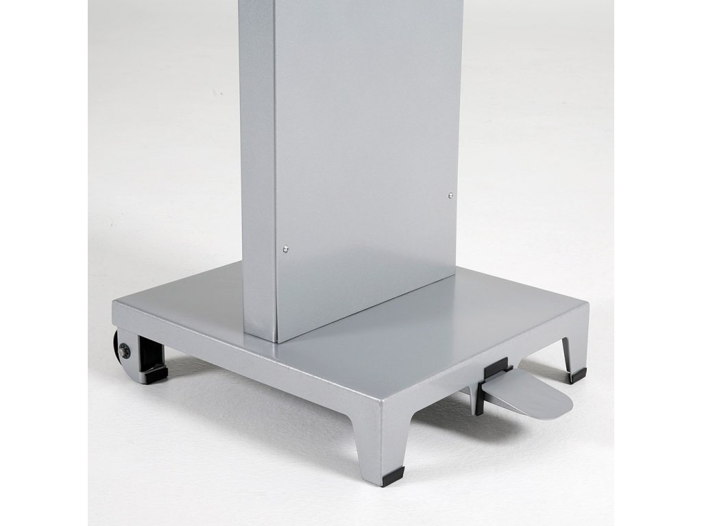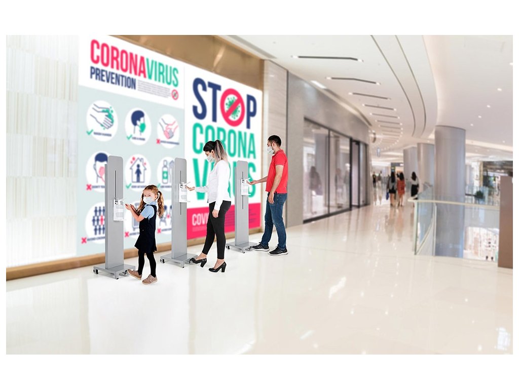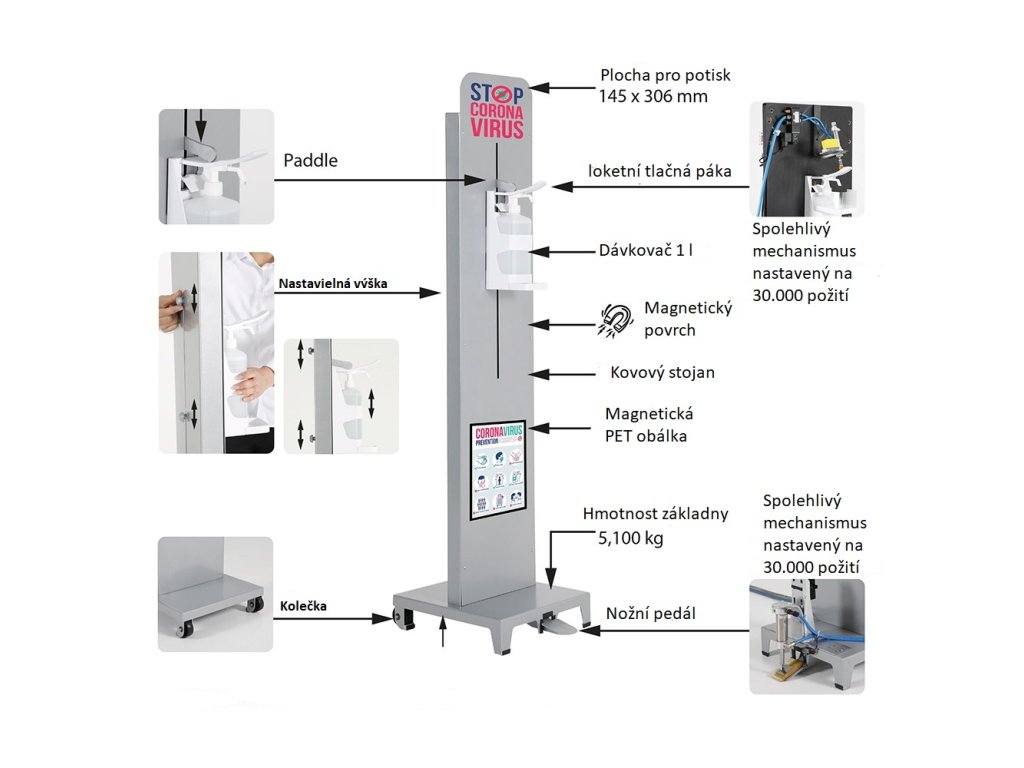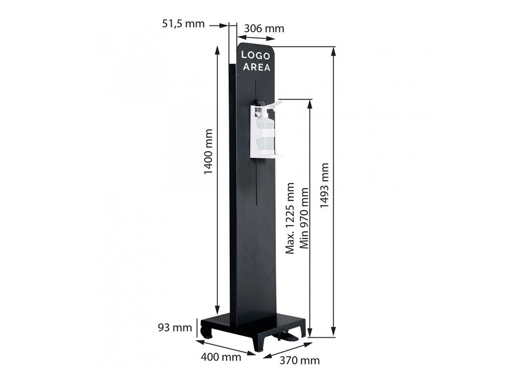 Výšku stojanu lze nastavit od 970 mm do maximálně 1225 mm. To umožňuje použití stojanu na jakýchkoliv veřejných místech jako jsou předškolní zařízení, školky nebo školy. Výhodou nožního bezdotykového stojanu je, že pro efektivní sanitaci rukou není nutný přístup k vodě nebo papírovým ručníkům. Stojan také nabízí možnost personalizace reklamou o ploše 145 x 306 mm.