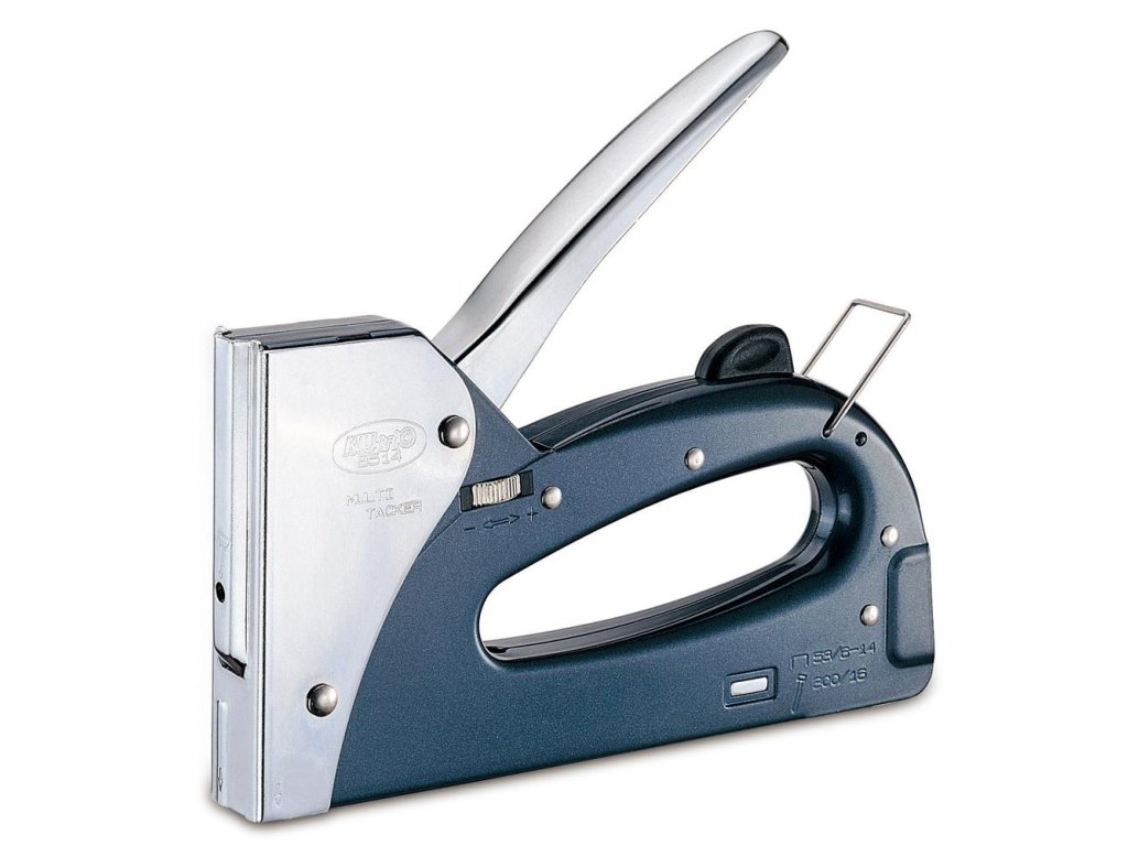 Výkonný celokovový tacker k připevňování dekoračních látek, fólií a kartónu.