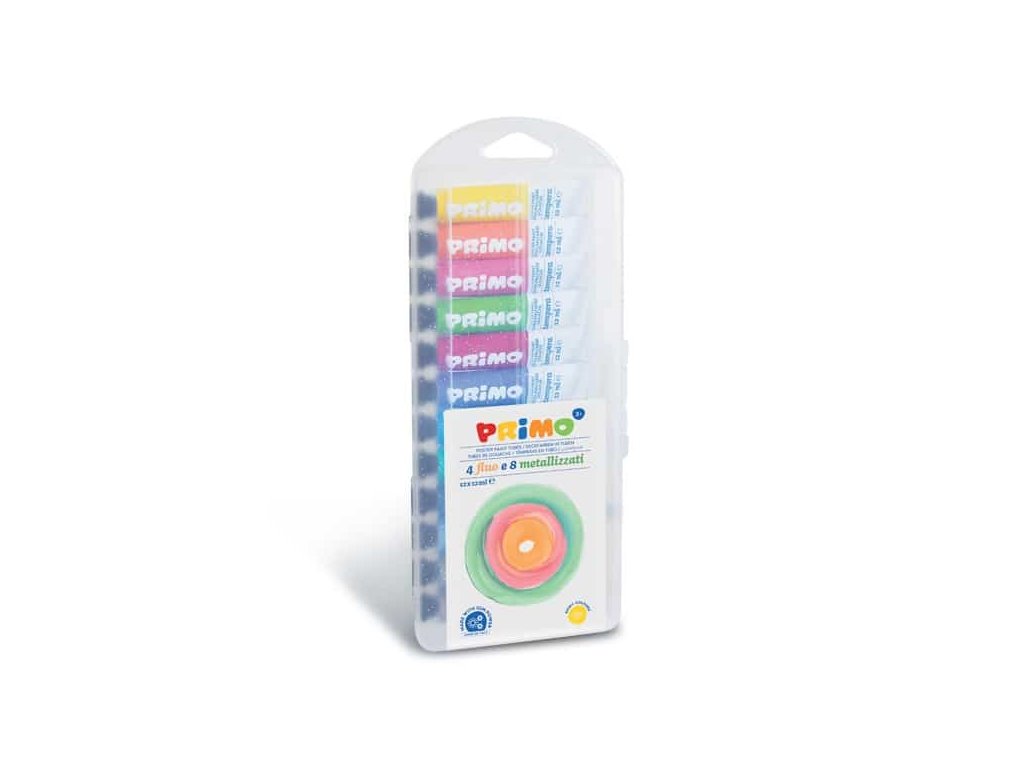 Temperové barvy PRIMO, sada 12 x 12ml, 8 METALLIC + 4 FLUO, tuby