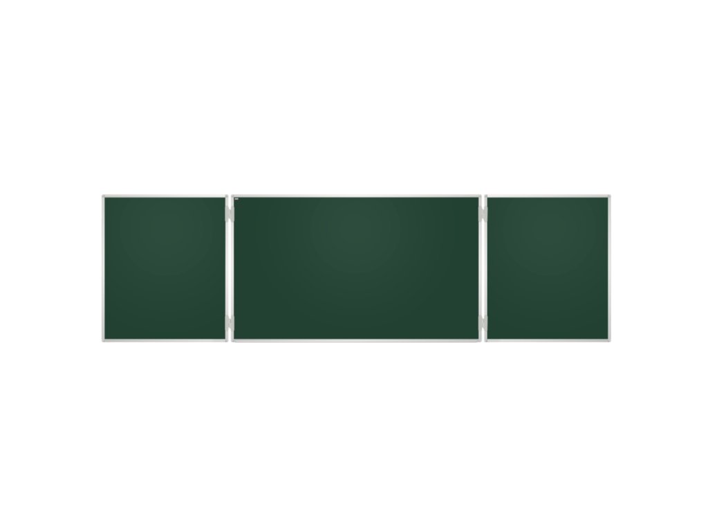 3 panelová tabule v hliníkovém rámu s keramickým povrchem vhodným pro psaní křídami, připevnění přímo na stěnu, zadní stěna z pozinkovaného plechu, motážní sada a odkládací lišta součastí balení.