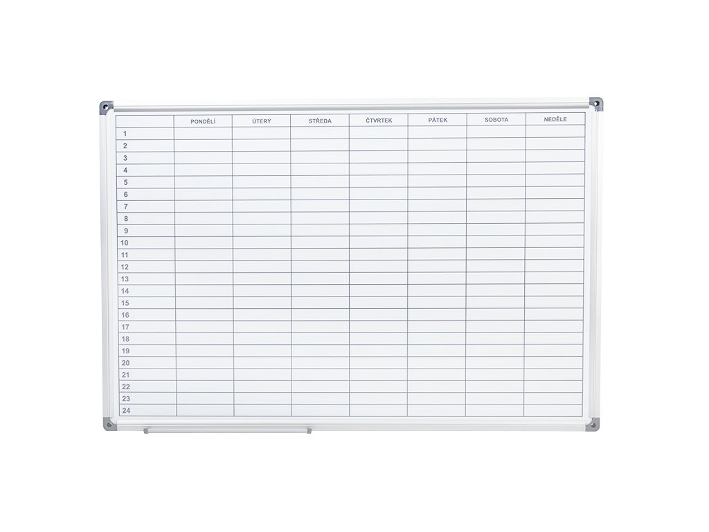 Týdenní plánovací tabule s kvalitním nátiskem rastru pro týdenní plánování. Sada pro připevnění, krytky rohů, odkládací lišta 30cm, popisovač a 3 magnety jsou součástí balení.