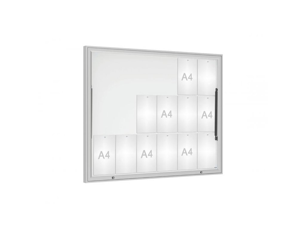 Venkovní voděodolná vitrína s horizontálním otevíráním. Rozměr 133 x 108 cm. (18 x A4). Hloubka vitríny je 58 mm. Vitrína je kryta tvrzeným bezpečnostnímm sklem odolným proti nárazům. Povrch je magnetický. Rám vitríny je z anodizovaného hliníku ve stříbrné barvě. Těsnící spoje jsou z elastomeru s otvory proti kondenzaci. Zadní stěnu tvoří pozinkovaný bílý plech. Panty jsou integrovány. Nechybí bezpečnostní zámek dveří se dvěma klíči.