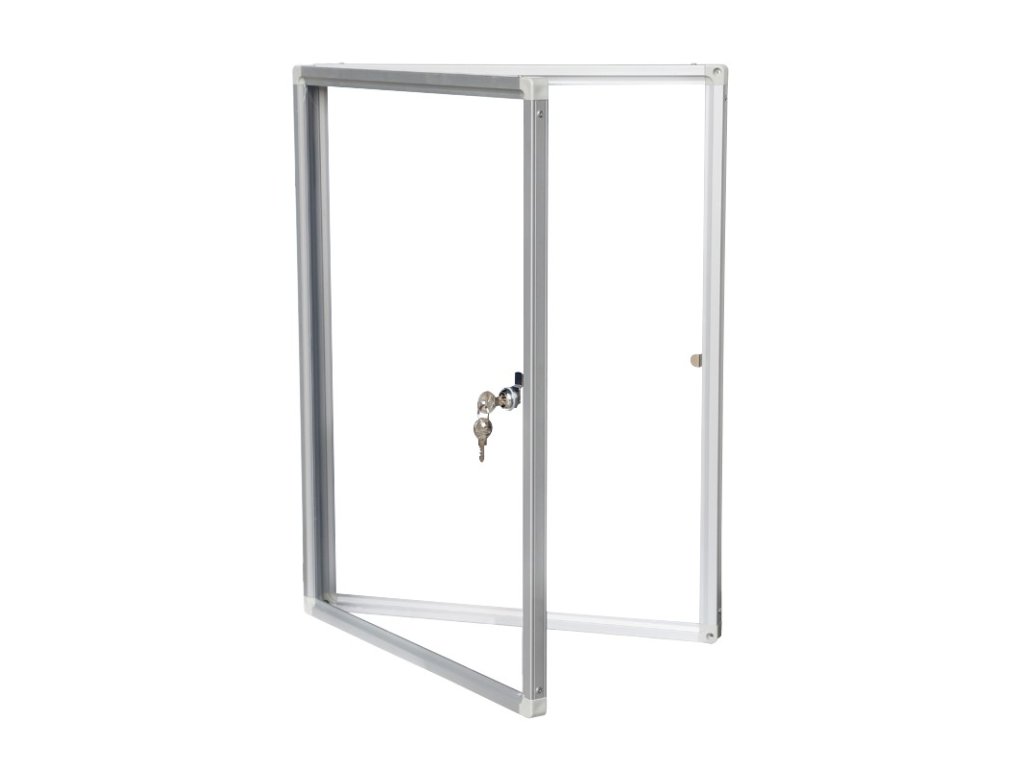 Interiérová vertikální vitrína ECO s robustním hliníkovým profilem UKF, plastovými rohovými spojkami. Vnitřní výplň magnetický lakovaný bílý plech . Polykarbonátové sklo. Uzamykatelná pomocí patentního klíče.